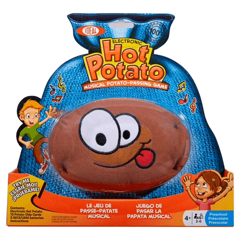The Ideal Hot Potato Electronic Musical Passing Game is a fun and active game for the whole family, suitable for children aged 4 and above and 2-6 players . The game is easy to learn and play , with simple rules and a musical twist. Players pass the plush potato while the music is playing, and the last one holding it when the music stops gets a chip. The game includes an electronic Hot Potato, 13 potato chip cards, and 3 AG13 batteries. The player with the quickest hands or best luck wins, and the game is a great way to get everyone moving and laughing together.